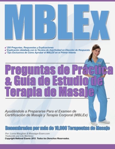 El sitio web Masaje-Examen, conocido por ofrecer una preparacion excepcional para el examen MBLEx, ha creado una seleccion de preguntas de ensayo para el MBLEx y que ahora ya estan disponibles en formato para impresion. Estas 250 preguntas, respuestas y explicaciones formuladas en base a los libros de texto curriculares de Masaje y que tambien aparecen en la Bibliografia MBLEx, le ayudaran a saber donde debe uno enfocarse antes de presentar el examen oficial. Estas preguntas de practica abarcan todas las categorias del examen MBLEx incluyendo la Valoracion del Cliente & los Beneficios y Efectos de la Tecnicas, la Patologia con sus Contraindicaciones y Precauciones, la Historia del Masaje, Etica, Limites, Leyes y Reglamentos, la Practica Profesional, Kinesiologia y Anatomia & Fisiologia. Junto con las preguntas de practica viene una guia de estudio que explica en que consiste la estructura de las preguntas de opcion multiple y ademas encontrara asesoria y consejos de expertos para aprobar el examen MBLEx. Lorna Maughan - LMP, es autora e instructora en Masaje-Exam.com. Nuestro objetivo es proporcionar la preparacion en masaje mas comprensible, completa y disponible.